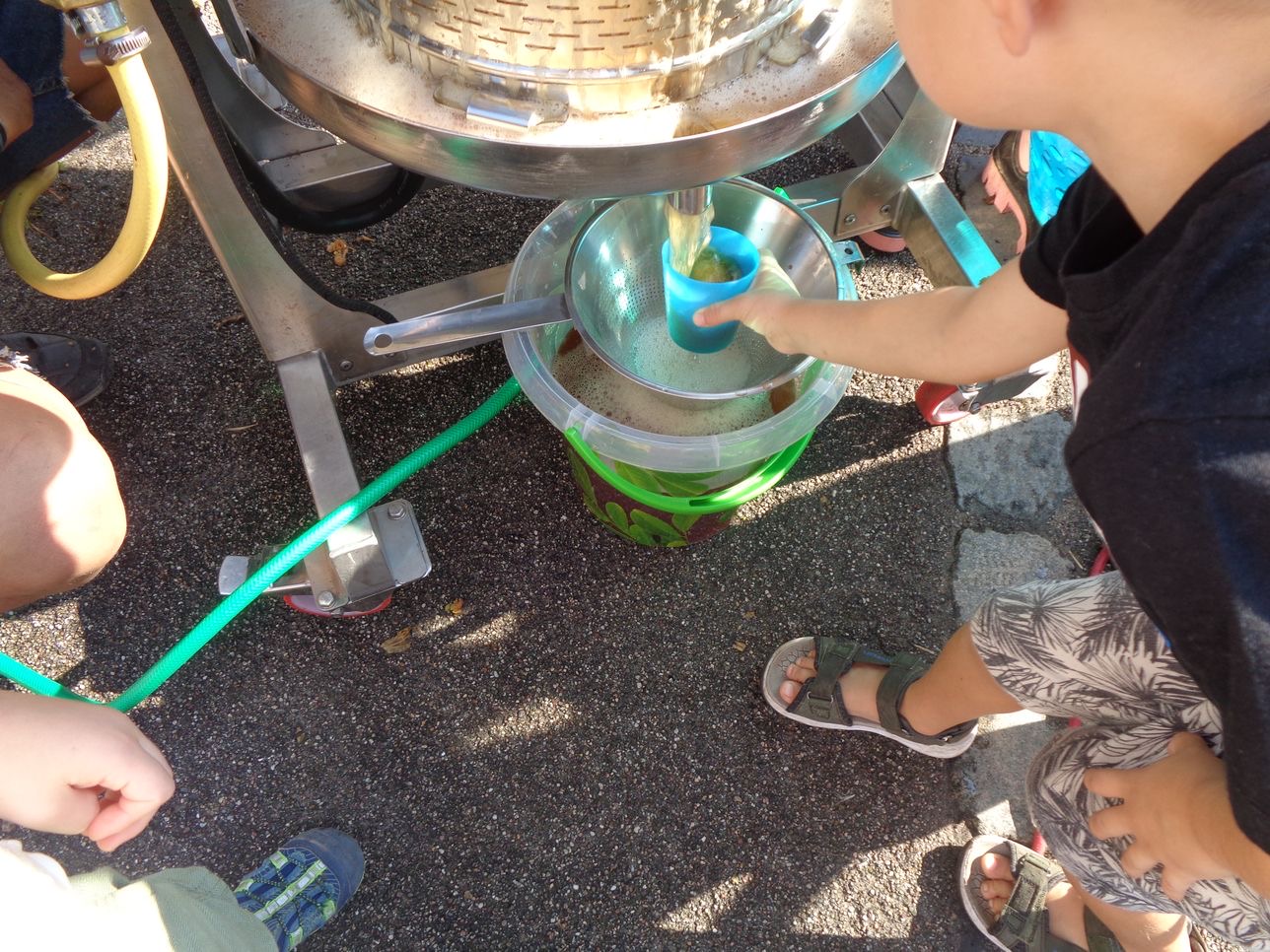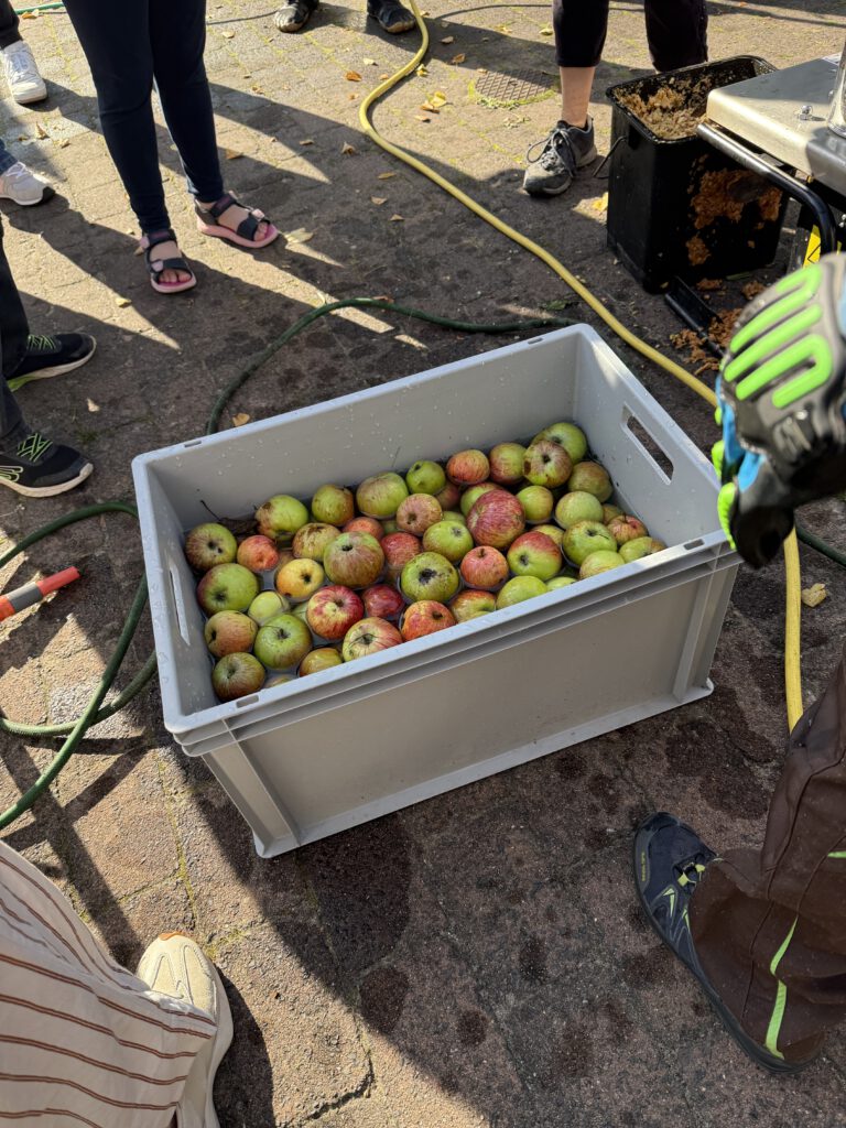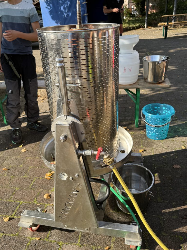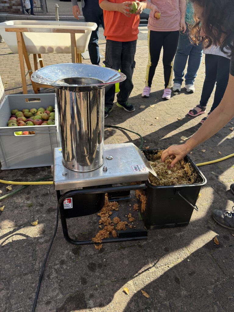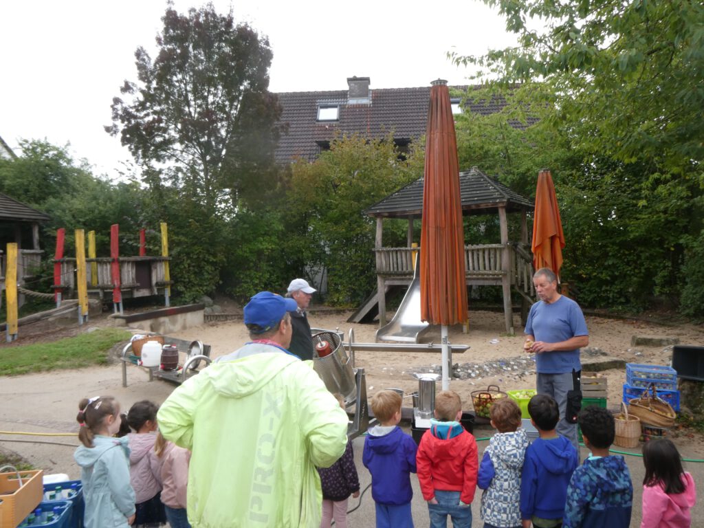 Unser diesmal rein männliches Team Jürgen Lamberty, Burhan Döndü, Josef und Peter Henrich erklärten den Kindern den Ablauf von der Lese bis zum Pressen mit einer Hydropresse. Erzieher und Kinder halfen fleißig mit, die Äpfel zu waschen, in den Muser zum Schreddern zu befördern und dann in der Kelter mit Wasserdruck zu pressen. Der, frische „Süße“ wurde direkt vor Ort verkostet und konnte mit nachhause genommen werden. Kann er doch zu Gelee, zum Beimischen zu Smoothies, Pudding oder beim Backen verwendet werden