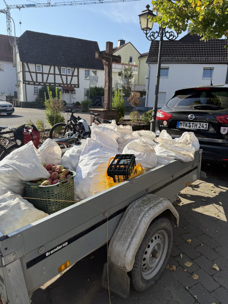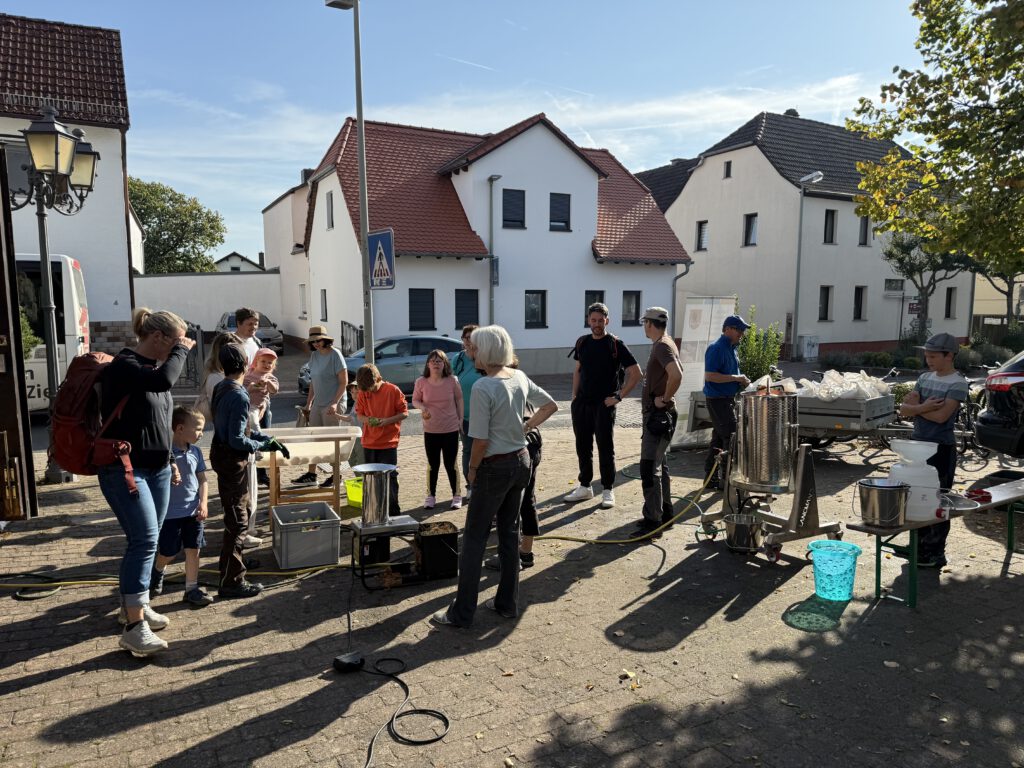 Zum Abschluss am 20. September fand dann das öffentliche Keltern „Am Platz an der Linde“, statt. 13 Vereinsmitglieder waren aktiv und es konnten viele Großeltern, Eltern und Kinder erreicht werden. Diese verarbeiteten bei herrlichstem Wetter die am Tag vorher in der Apfelplantage des 1. Vorsitzenden Thomas Henrich gelesenen Mischäpfel. Der „frische Süße“ aus dieser Vielfalt an Äpfel wie, Jakob Lebel, Trierischer Weinapfel oder Berliner Schafnase war dieses Jahr besonders lecker.