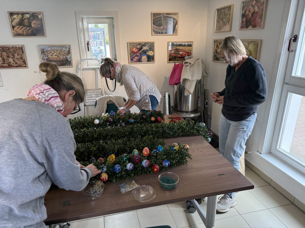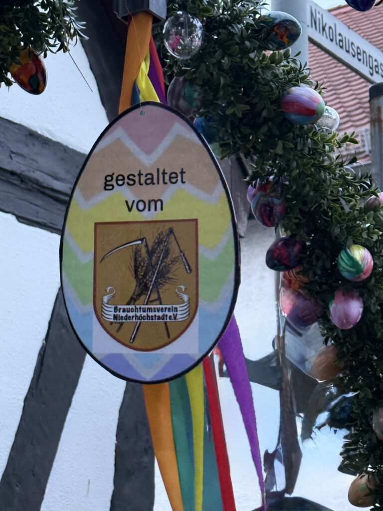 Die Krone wurde mit künstlichen Buchsbaumgirlanden versehen und ist mit verzierten Eiern von vier Frsuen des Brauchtumsvereins geschmückt.
