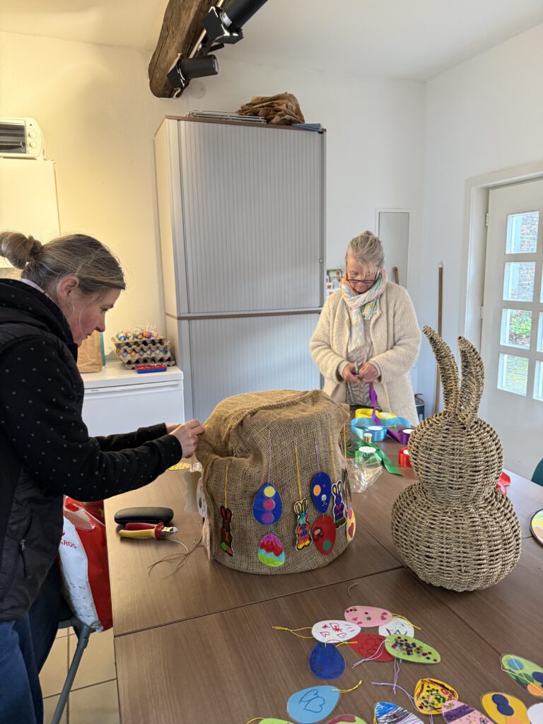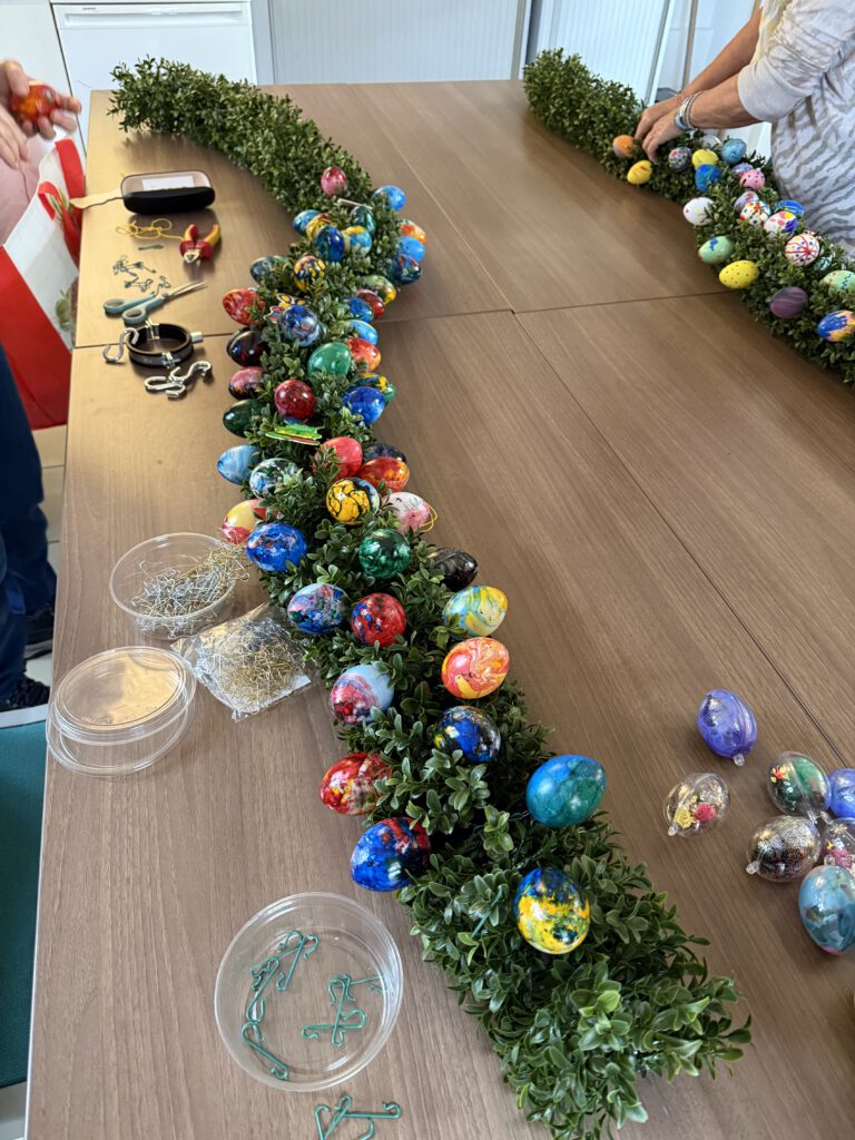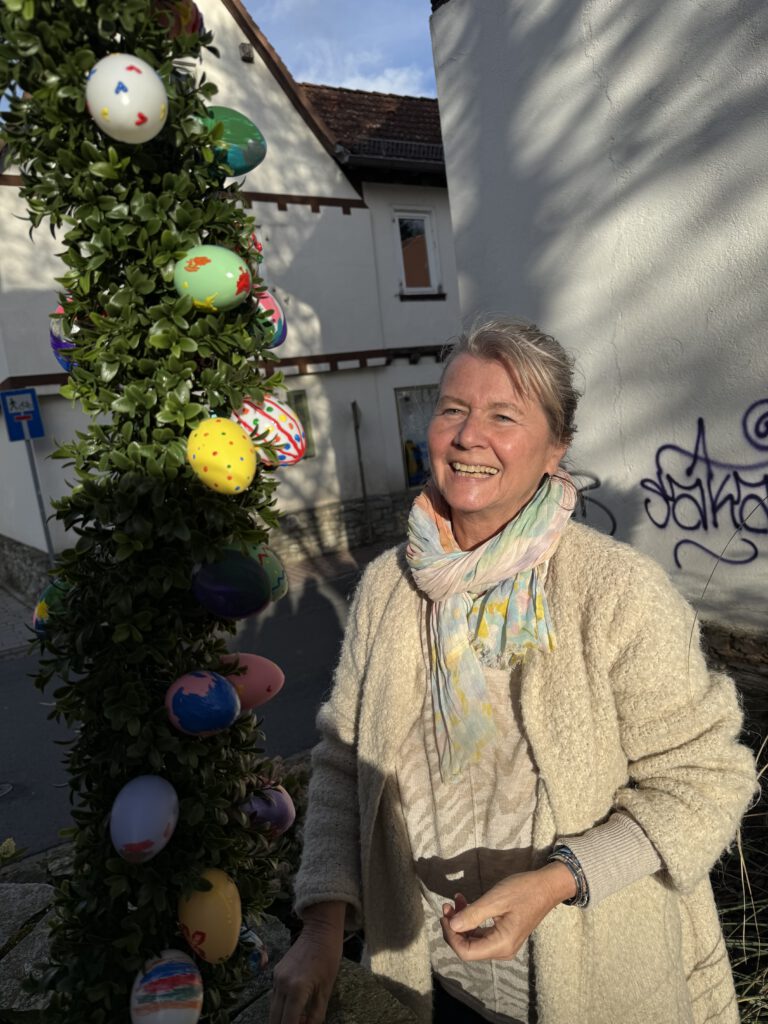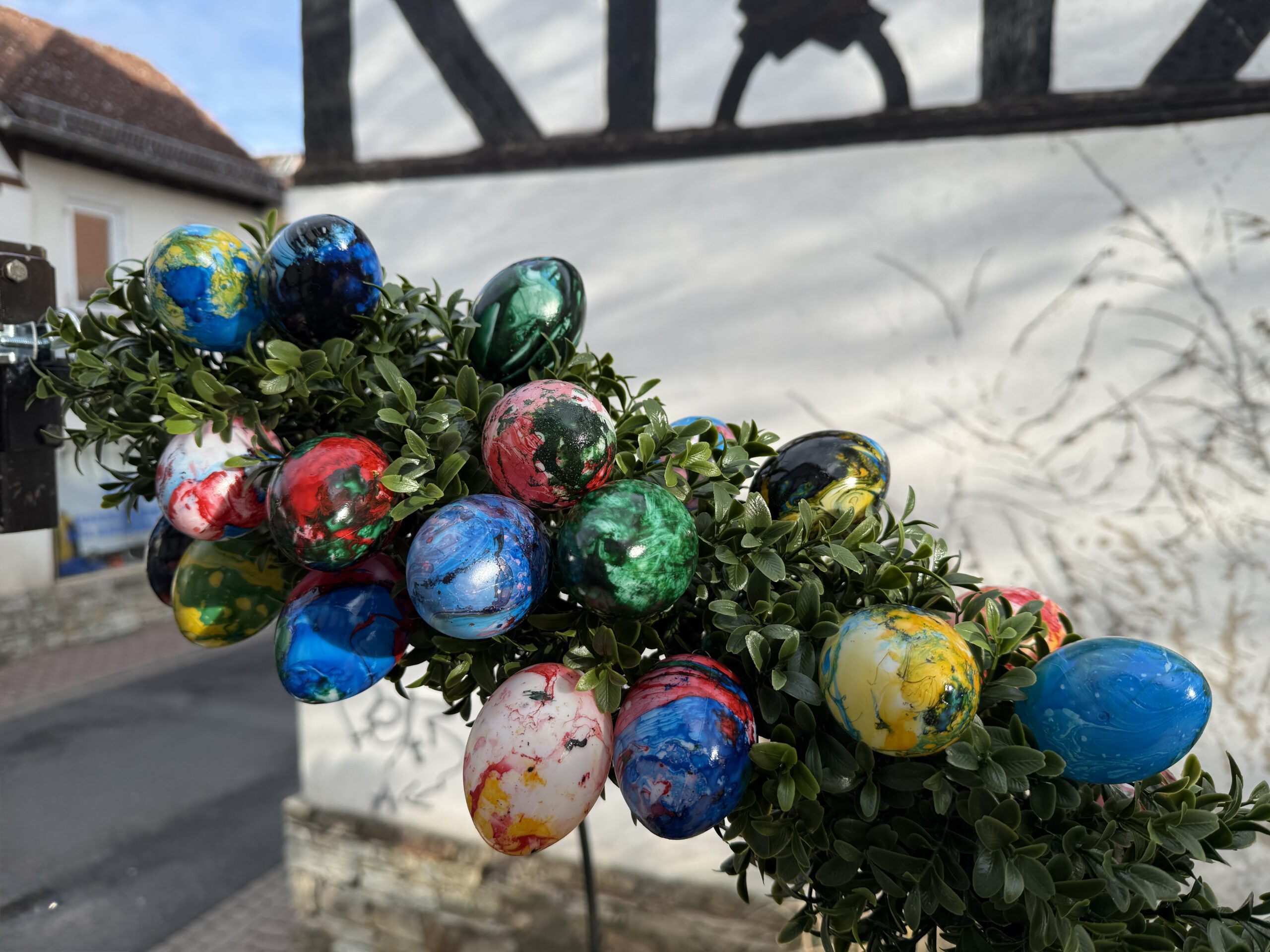 Wie bei „Klingelingeling, klingelingeling hier kommt der Eiermann“ wurden die viele bunten Eier von Kinderhand gefertigt. Je eine Girlande wurde von den Kindertagesstätten Raupenland, Ritterhof, Schillerstraße und In den Weingärten gestaltet und in der Woche vor Ostern angebracht.